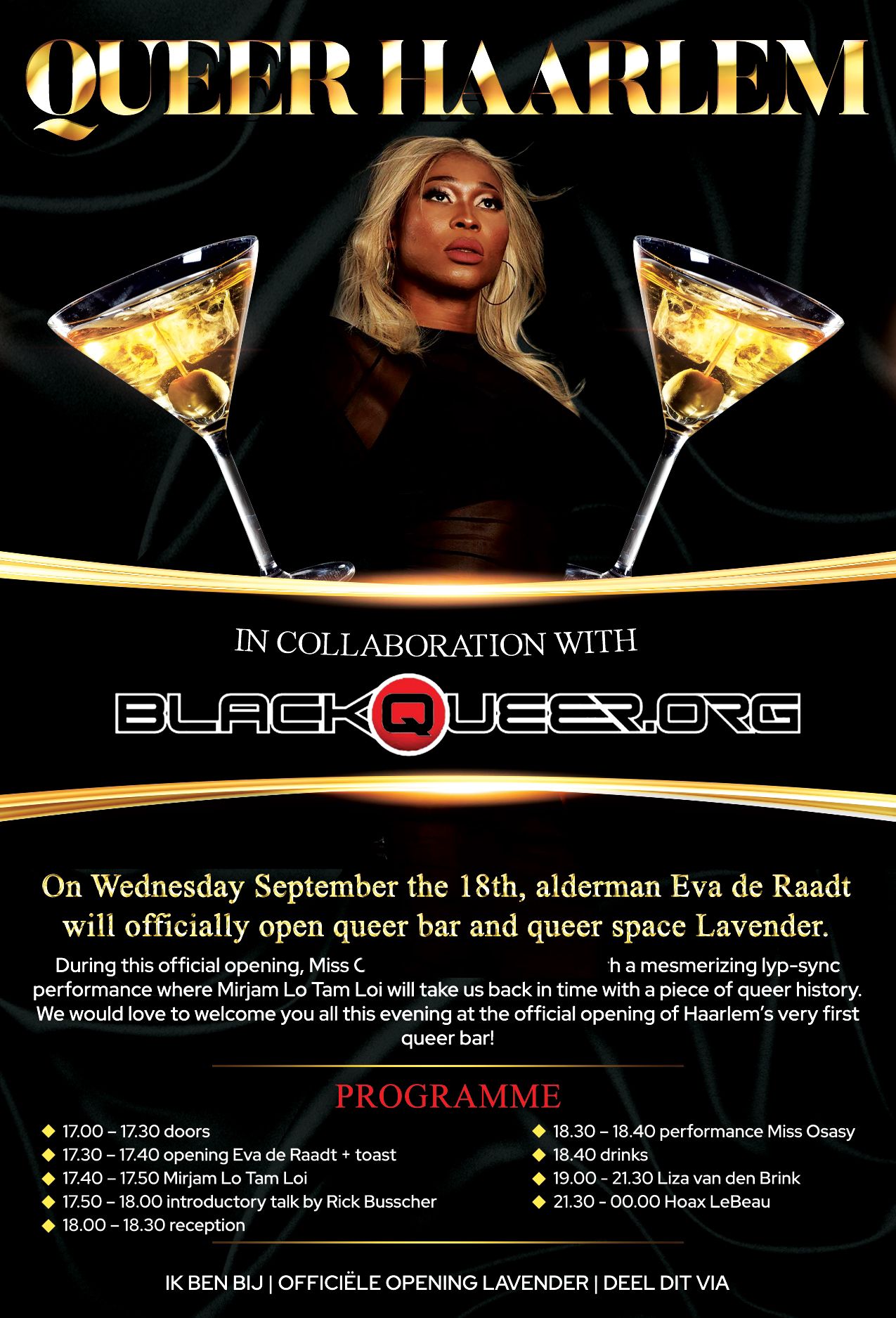 Vanaf 19.30 uur worden gasten verwelkomd met een bijzondere foto-expositie van Mariska de Jong en Ben de Rooij, die de rijke geschiedenis van de Black Queer gemeenschap sinds de Roze Zaterdagen in 1994 in beeld brengt.