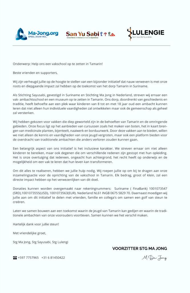 Een bijdrage leveren aan de instandhouding en ontwikkeling van de culturen van de Marrons en Inheemse bevolking in Nederland en Suriname. Focus ligt hierbij onder meer op het verbinden van kwetsbare mensen. Stichting Ma Jong wil dit bereiken door de netanisatie van diverse activiteiten en projecten op het gebied van onderwijs, traditie, geschiedenis en godsdienst in de specifieke talen van de Marrons en Inheemse bevolkingsgroepen. Tevens wil stichting Ma Jong juridische informatie aan beide groepen inzake uitvaarten, erfenissen en de Nederlandse en Surinaamse wetgeving. erfenissen.